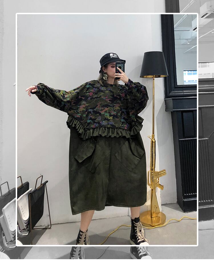 ドレス スプリングオータム薄手迷彩柄ベルベットスカート ロング 大きめサイズ 春物 秋物 ステッチ ラブタオタオダレンハウス28085516093