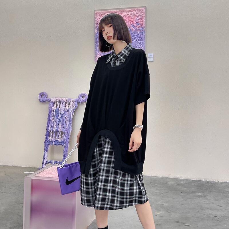 ブラックホワイト格子柄ドレス サマールーズ薄手スタンダードカラーシャツ ロングスカート レトロ 夏物 ラブタオタオダレンハウス662360561