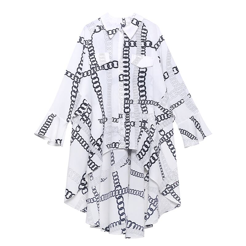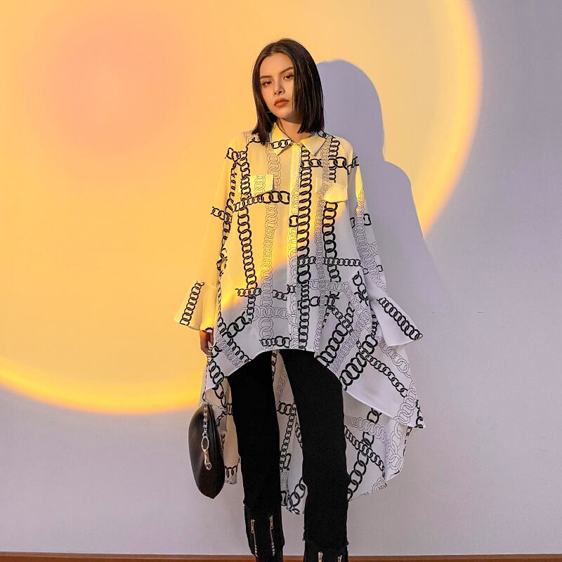 プリントシフォンシャツ レディーススプリングルーズロングショートバックブラウス 春物 ラブタオタオダレンハウス915089646