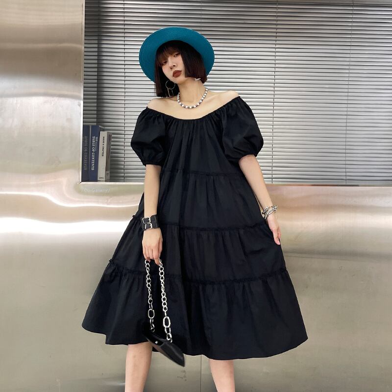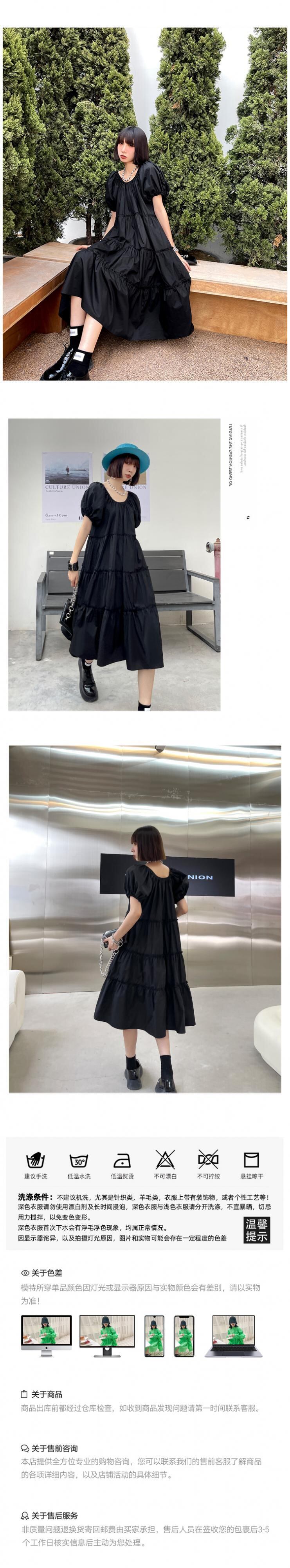 スリーブドレス サマースタンダードスタイルブラックショートルーズ薄手Aラインロングスカート レトロ 半袖 ハーフスリーブ 夏物 ラブタオタオダレンハウス88485751430
