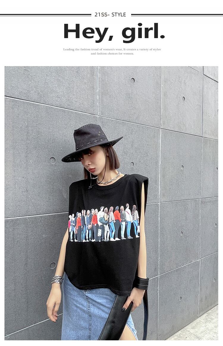 ブラックノースリーブTシャツ シャツ レディースサマープリントルーズ薄手 コットン 夏物 ピュア ラブタオタオダレンハウス85566742722