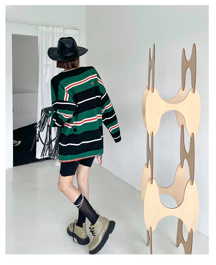 セーター レディースオータムラウンドネックルーズ薄手ストライプスタイルカジュアルニットジャケット 秋物 Oネック ラブタオタオダレンハウス50660687494